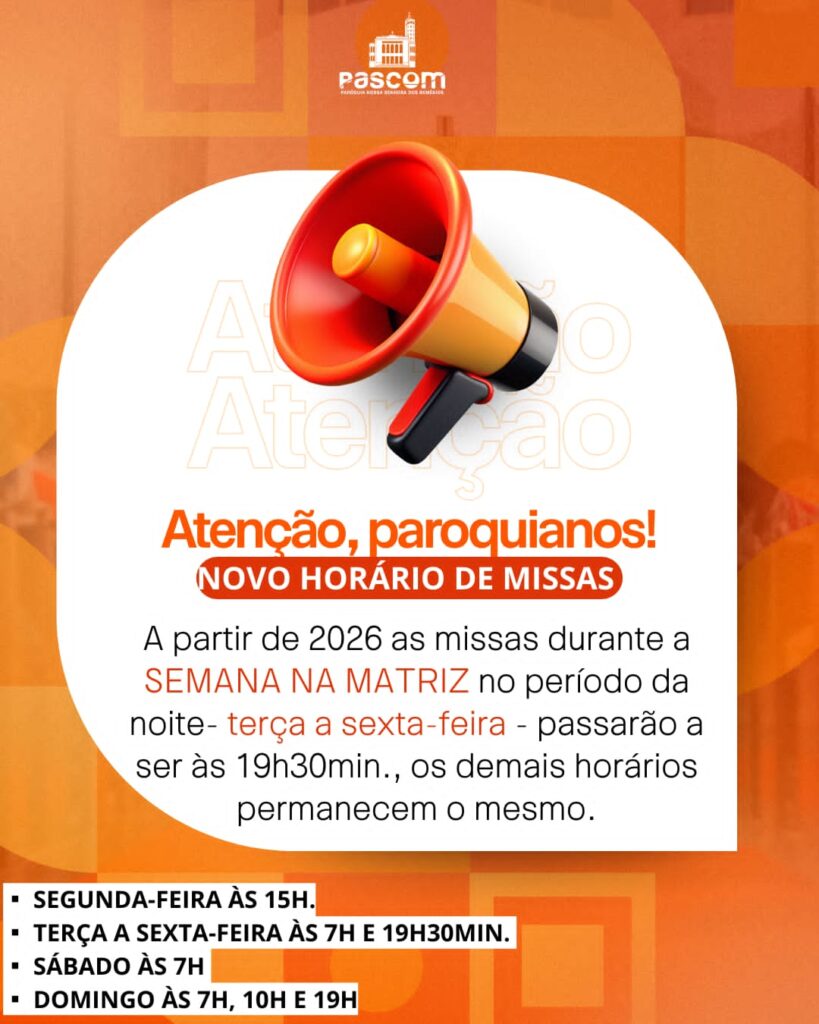 📣 ATENÇÃO, PAROQUIANOS! A partir de 2026, as Missas na Comunidade Matriz Nossa Senhora dos Remédios, de terça a sexta-feira, no período da noite, passarão a acontecer às 19h30. ⛪ Os demais horários de Missa em toda a Paróquia permanecem os mesmos, como de costume. Agradecemos a compreensão e o carinho de todos.Que Deus abençoe […]